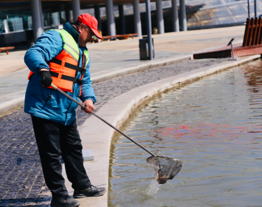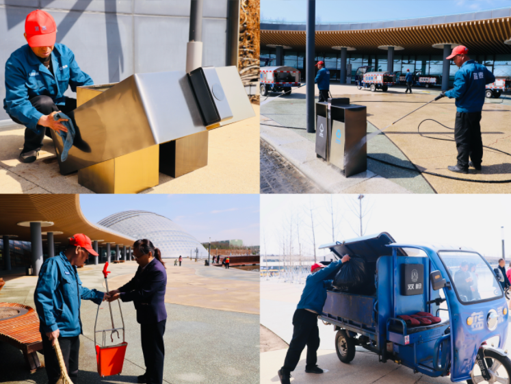 湖面上,打捞人员手持捞网,仔细地清理着水中的杂物,无论是漂浮的落叶还是细小的垃圾,都被一一清除,让湖水保持清澈见底。而在园区各处,保洁人员还细致地擦洗着垃圾桶,确保这些公共设施不仅外观整洁,内部也干净无异味。